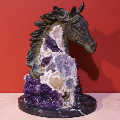 Статуэтка "Голова коня" покрытие бронзой и аметист, подставка яшма