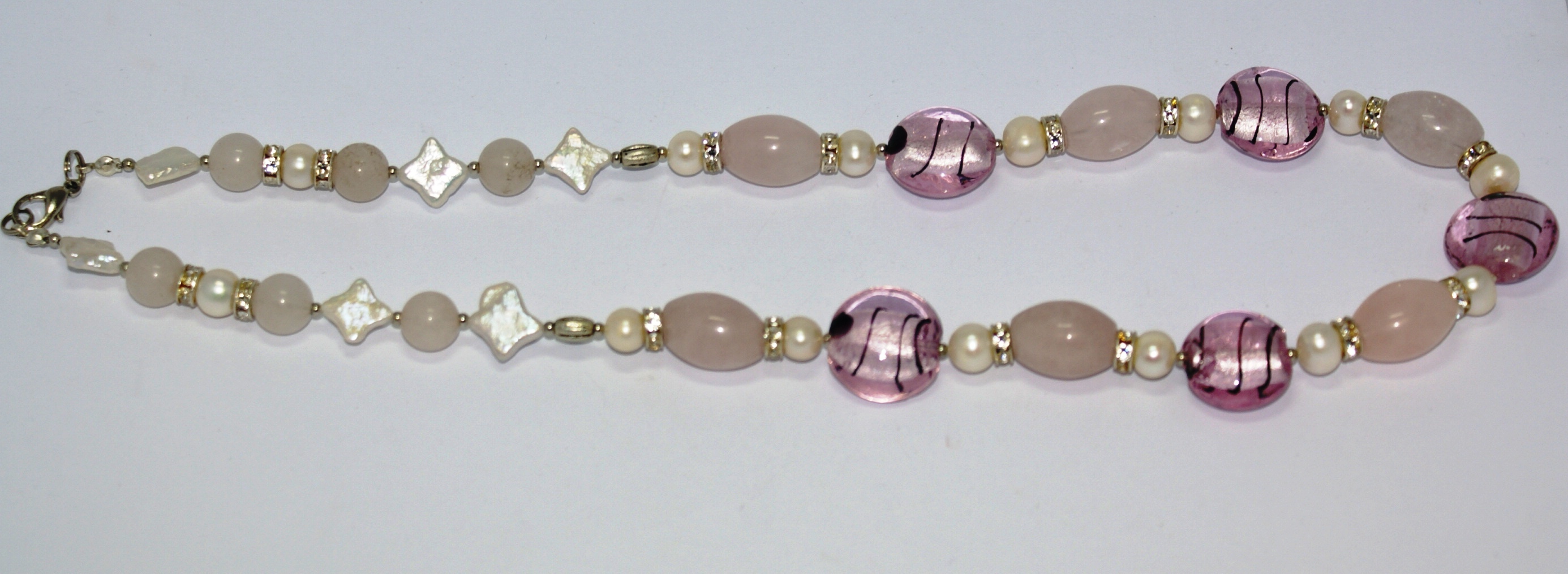 Состав: розовый кварц, жемчуг, муранское стекло, стразы